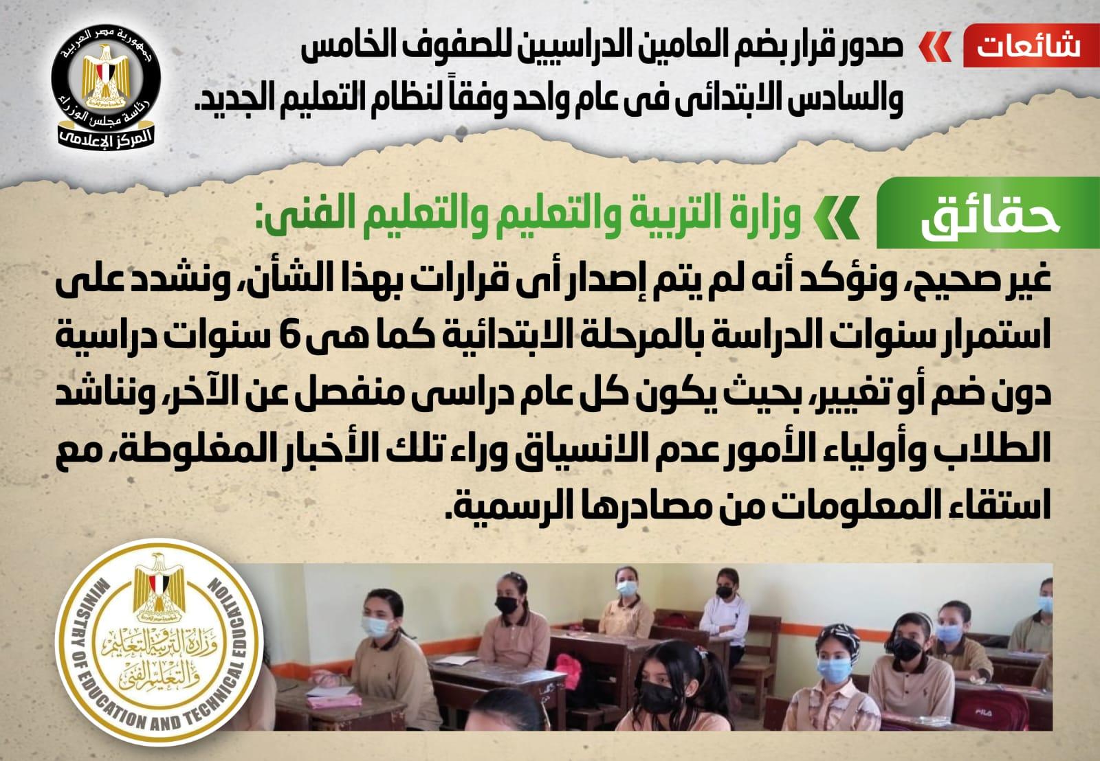التعليم تنفي صدور قرار بضم العامين الدراسيين للصفوف الخامس والسادس الابتدائي في عام واحد وفقاً لنظام التعليم الجديد