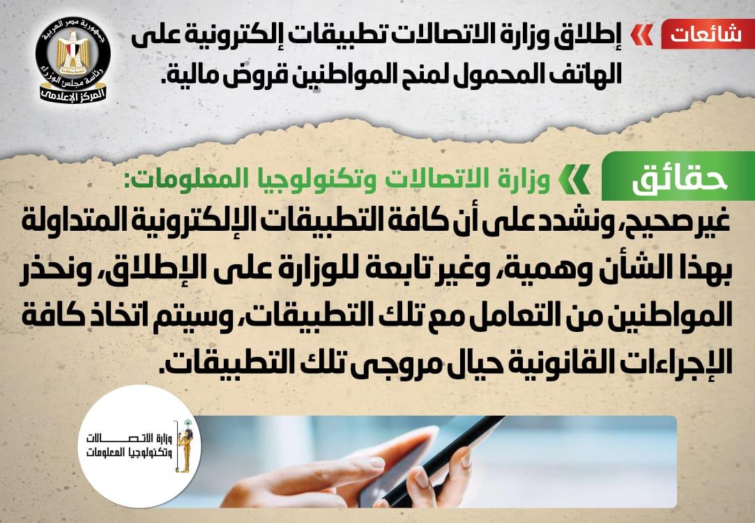 وزارة الاتصالات توضح حقيقة تطبيقات إلكترونية على المحمول لمنح المواطنين قروض مالية