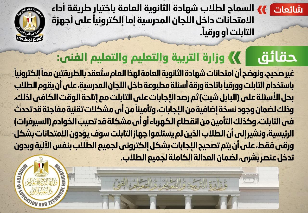 التعليم تنفى السماح لطلاب شهادة الثانوية العامة باختيار طريقة أداء الامتحانات داخل اللجان المدرسية إما إلكترونياً على أجهزة التابلت أو ورقياً