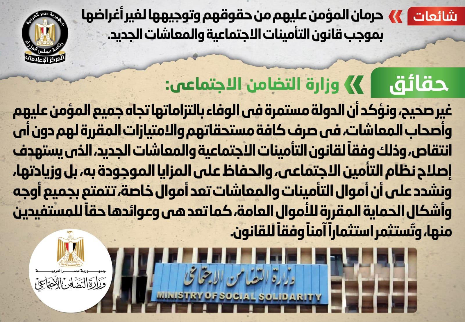 التضامن توضح حقيقة حرمان المؤمن عليهم من حقوقهم وتوجيهها لغير أغراضها بموجب قانون التأمينات الاجتماعية والمعاشات الجديد